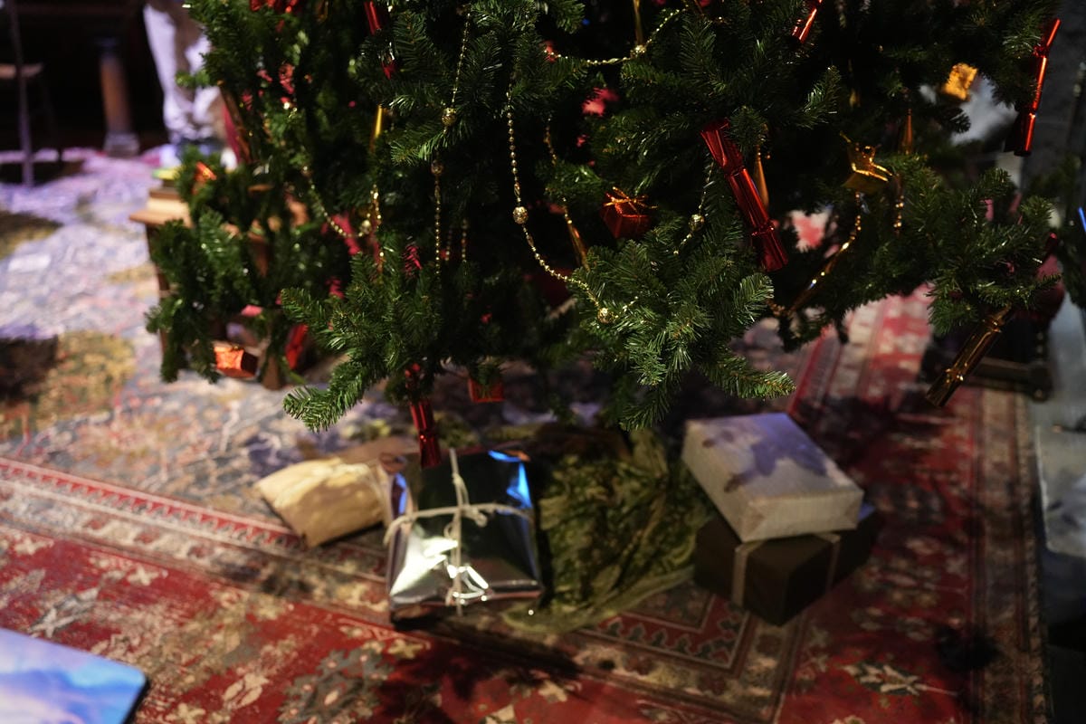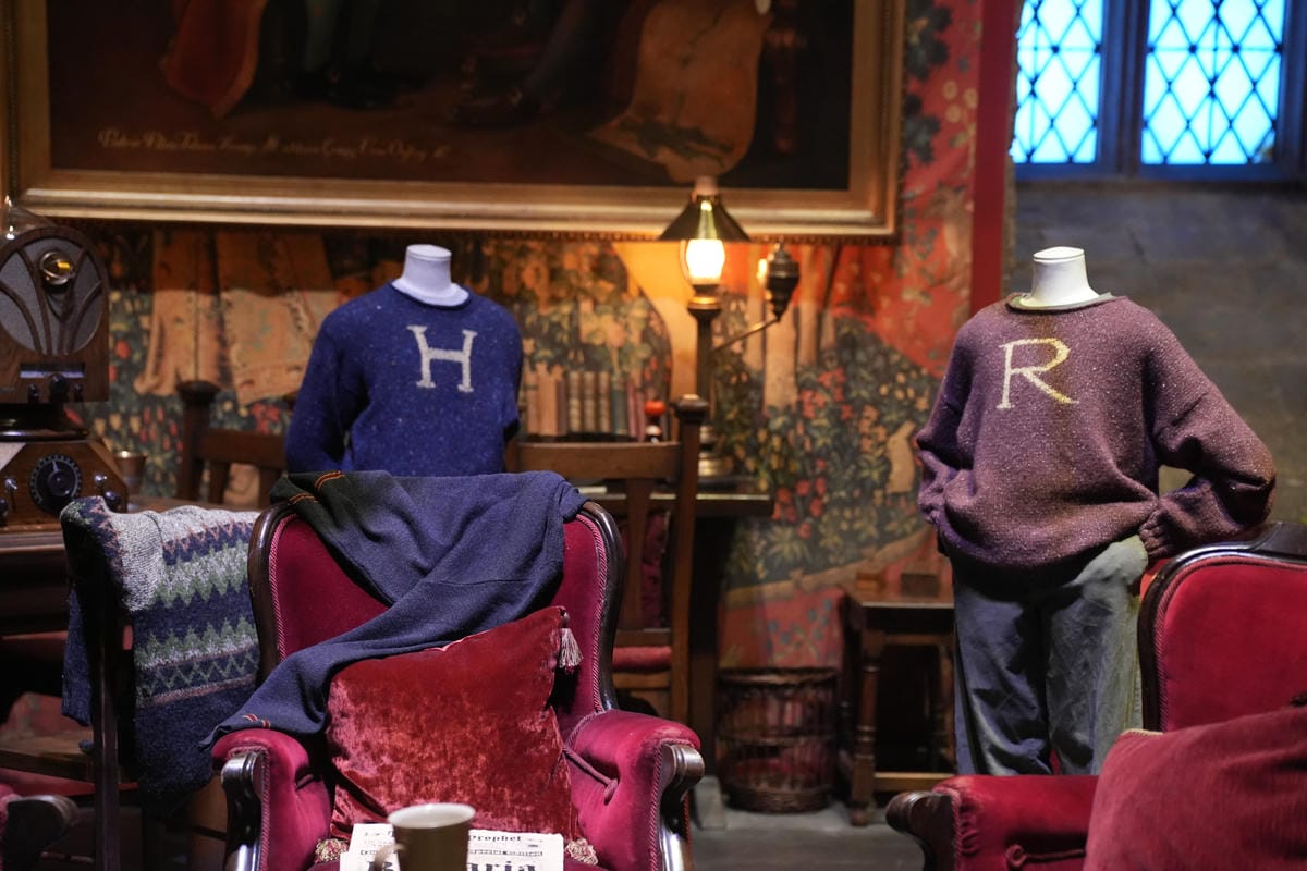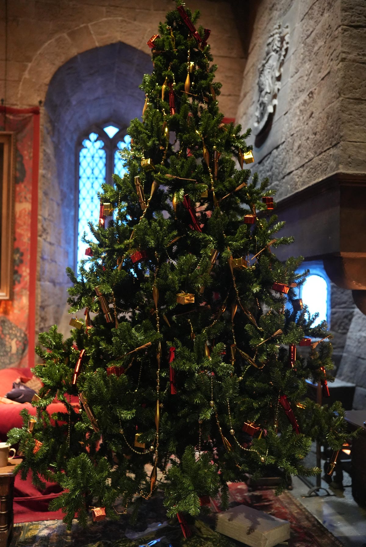 談話室の中心には、モリーが編んだロンとハリーのセーターが展示されており、クリスマスツリーやプレゼントなどクリスマスらしい飾り付けが施されております。