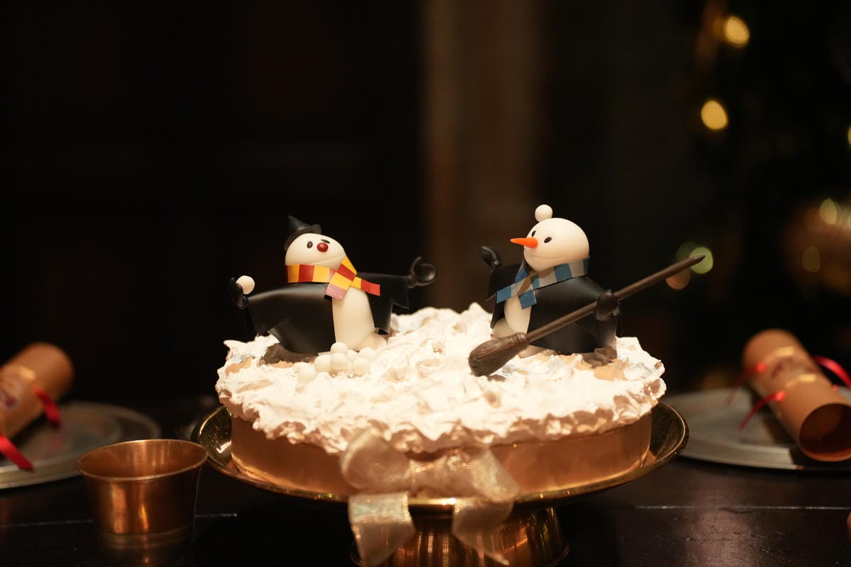 大広間のもクリスマスツリーなど、クリスマスの飾りつけがたくさんありますが、特に注目してほしいのがテーブルの上のケーキに乗った雪だるまです。