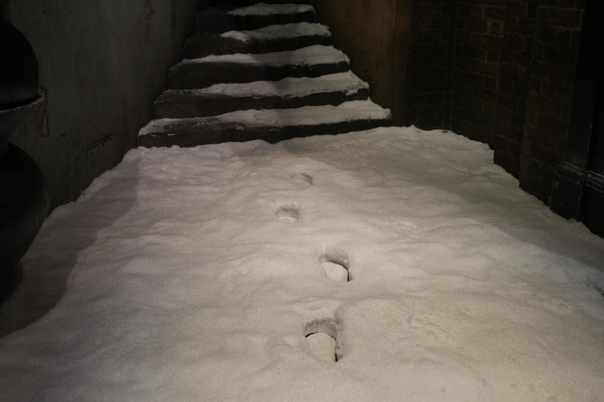 さらに驚きなので、雪におおわれた路地に足跡がついていき、まるでハリーとロンが透明マントに入って歩いているところに遭遇したような気分に。