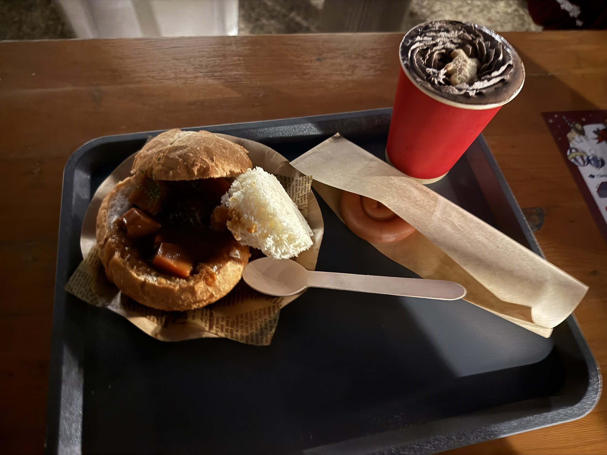 私も温かいココアとビーフシチュー、ソーセージを購入して、満喫しました。