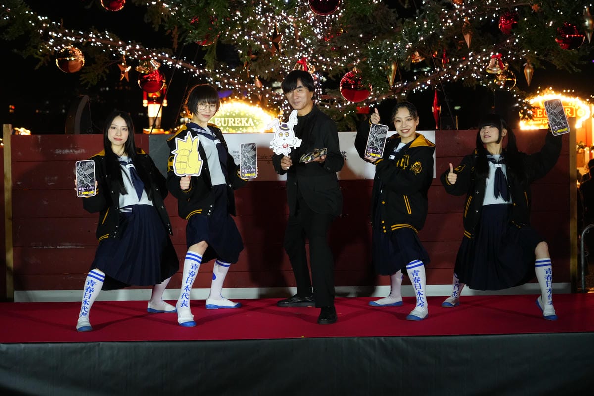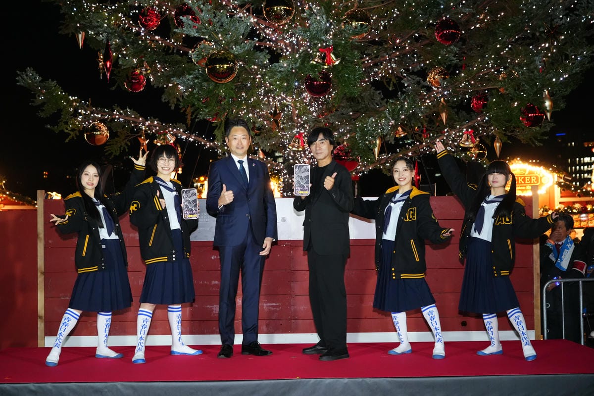 横浜が舞台となった作品を記念して、クリスマスツリーの点灯式には、株式会社横浜⾚レンガ 代表取締役社⻑ 岩﨑求起氏の他に、河森監督と同作で主題歌、さらにゲスト声優を務めた新しい学校のリーダーズが登場いたしました。
