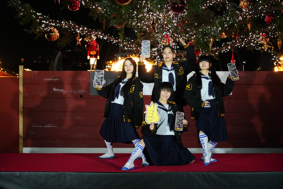 Christmas Market in 横浜⾚レンガ倉庫過去最⼤の約12mにアップデートされたメイン会場の巨⼤なツリーの前に登場した新しい学校のリーダーズのメンバー、そして河森監督。河森監督は「みなさんこんばんは。今⽇はよろしくお願いします︕」と、映画にちなんだスマートフォンのプロップスを持って登場すると、多くの歓声が上がり、さらに、新しい学校のリーダーズが登場すると、「AG︕」というコールをはじめとして、多くの歓声があがった。