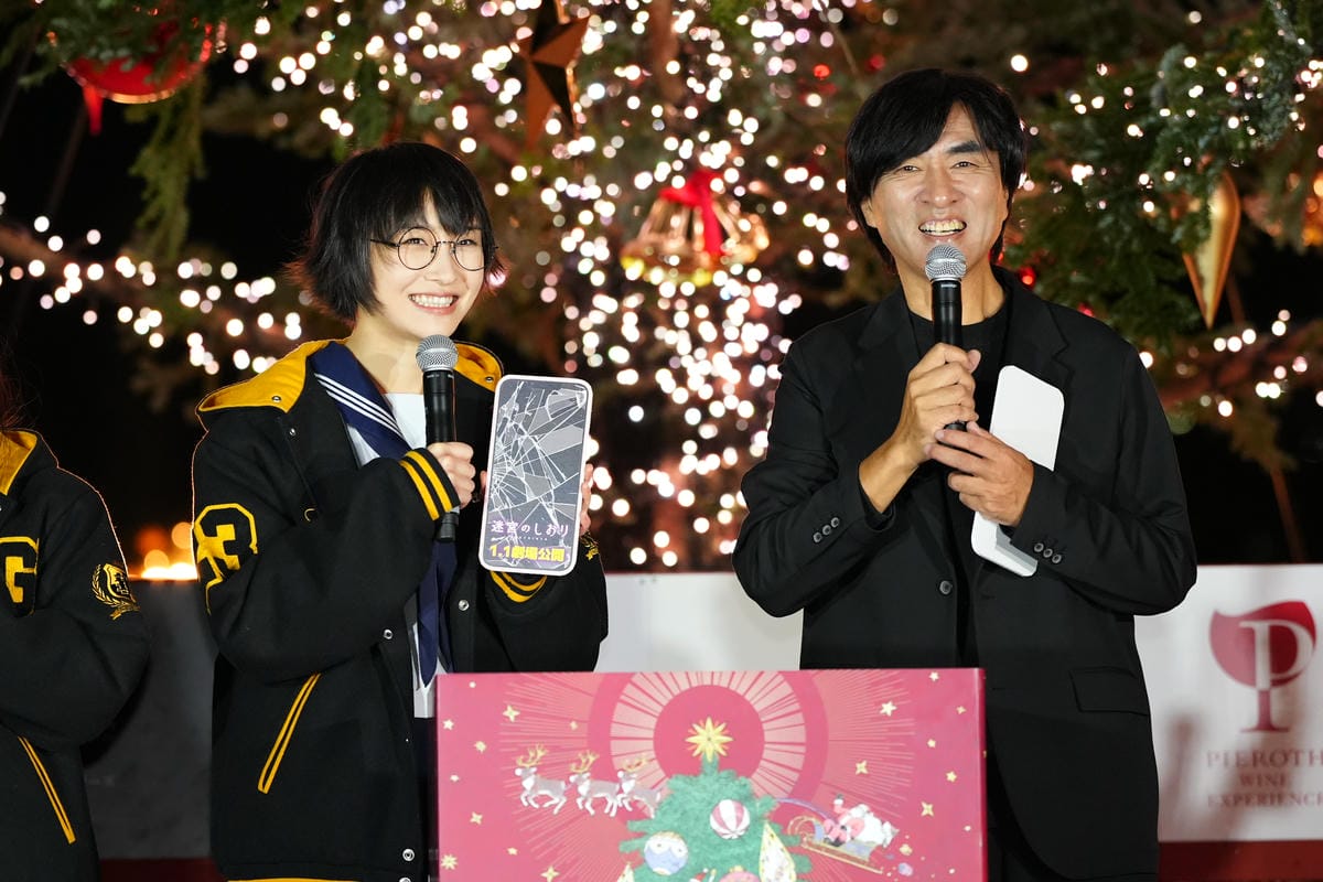 また、監督は⾃⾝初の⻑編アニメーション映画である『迷宮のしおり』とのコラボに、クリスマスツリーの点灯が待ちきれない様⼦で、「ここ⾚レンガ倉庫も映画の舞台になっているので、横浜育ちとしてこんなに光栄なことはないと思っております。」とコメント。点灯を前に、「この(点灯の)ボタンを押すと、みんなのスマホが割れたりして︕」と映画にかけたジョークも⾶び出す。