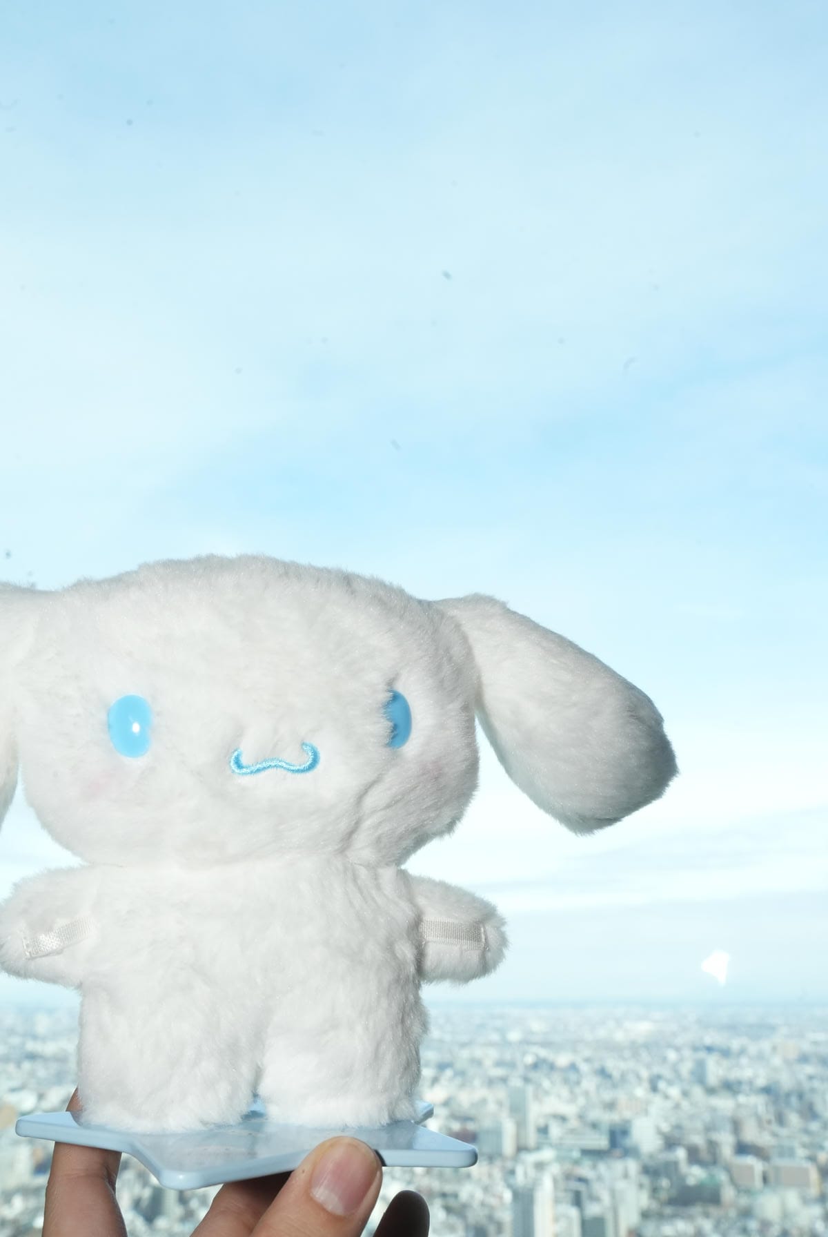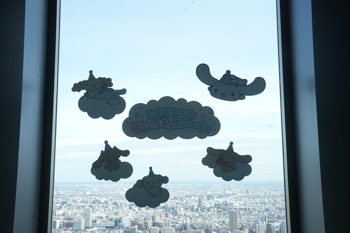 更に窓ガラスにはシナモロールたちのイラストは貼られていたり、60階の展望台だからこその、絶景を写真に撮ったり、シナモロールのぬいぐるみなどでの推し活も楽しめます。
