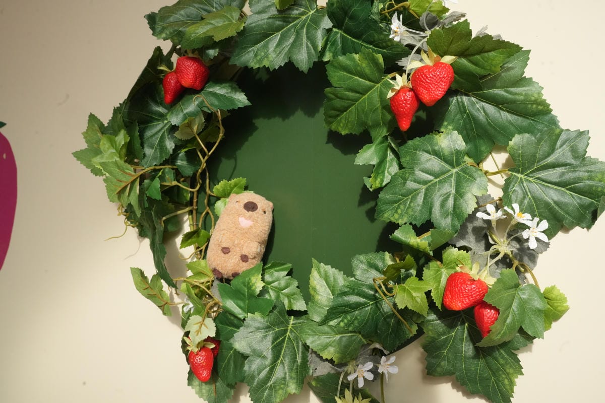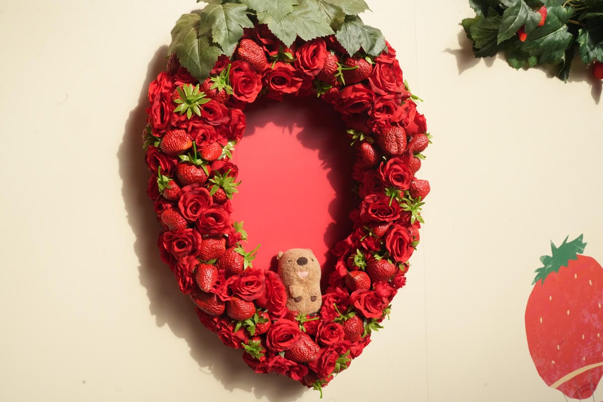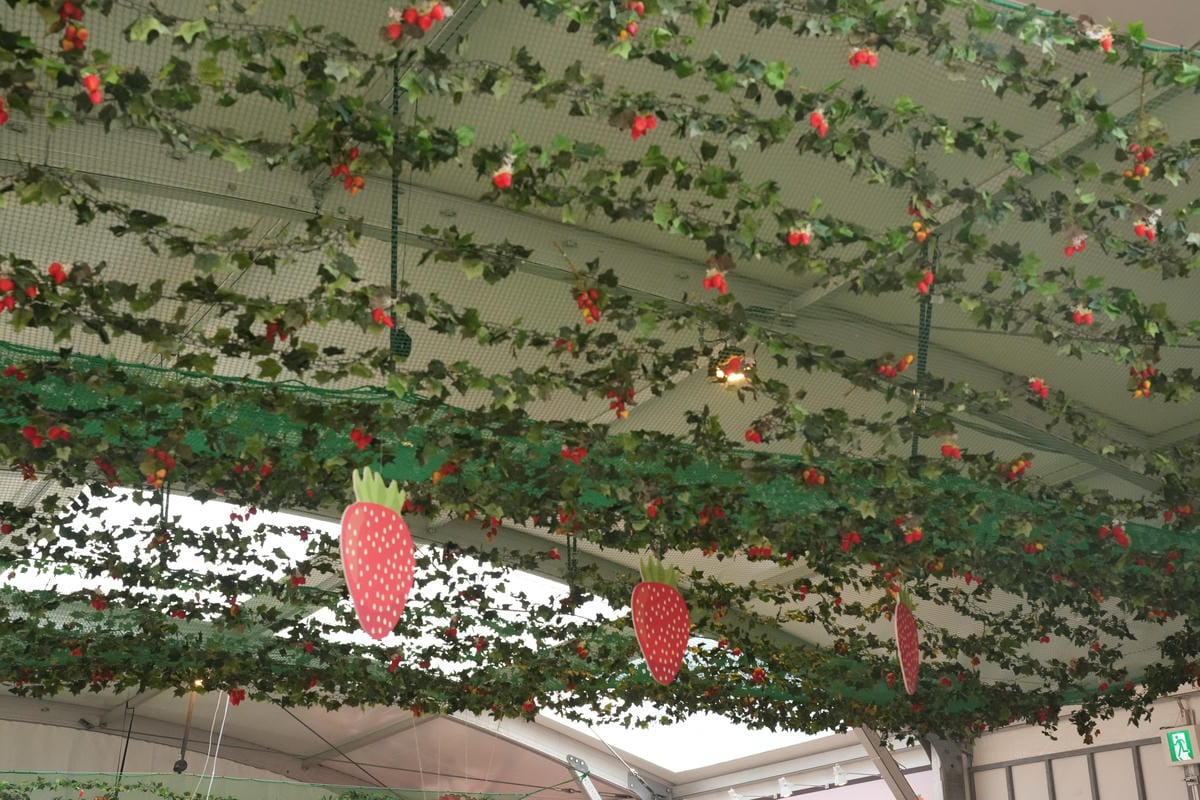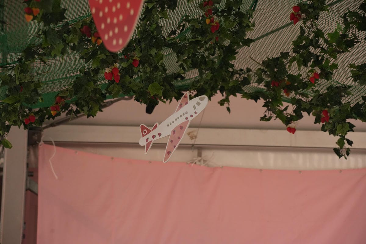 いちご畑を思わせるような装飾の中にはイベントテーマ「いちごトリップ」を思わせる気球や飛行機の装飾があります。